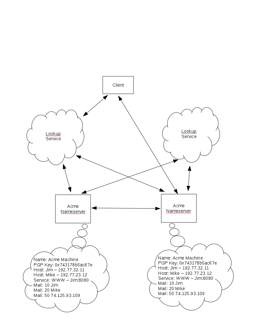 There are three levels to the architectural picture. At the top is a protocol that allows clients to make requests for database lookups. At the bottom is a protocol used to collect information from sites around the net to populate the databases for lookups. In between, there is room for several different and competing name services. Within itself, each of these name services may use whatever protocols and systems it wants. The primary difference from DNS at this point is the separation of the data from the name service which allows a practical means of setting up multiple name services.